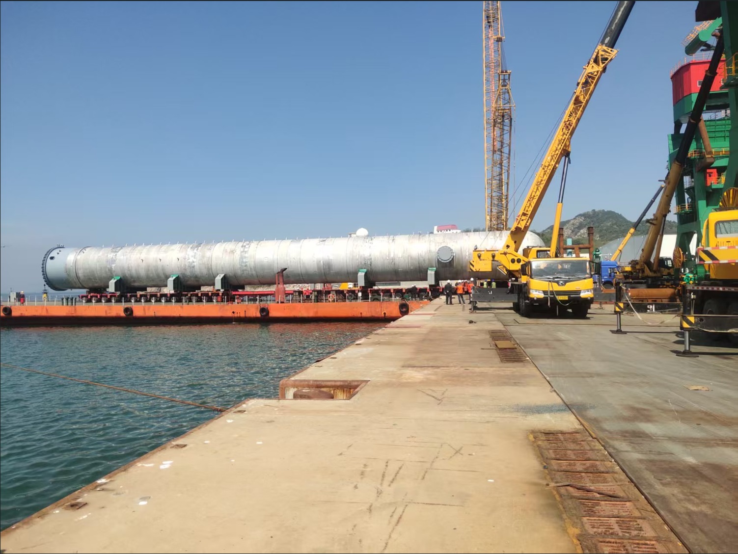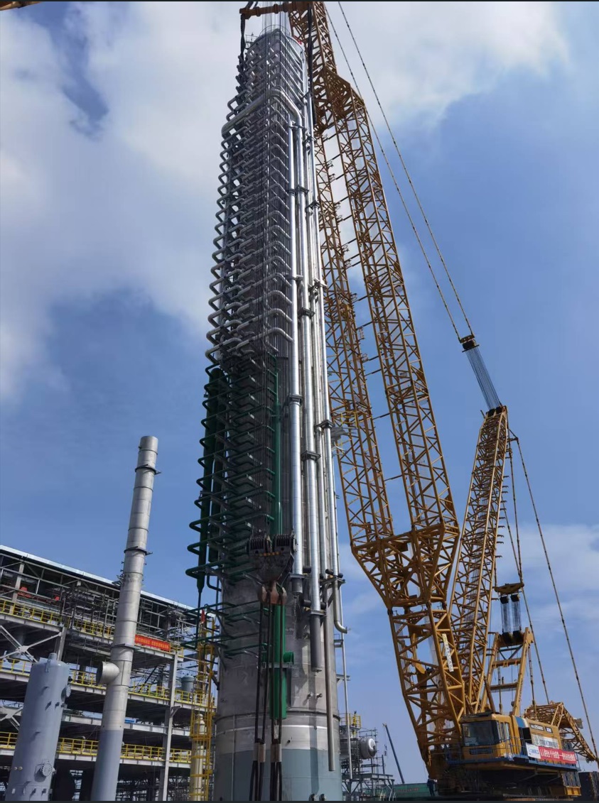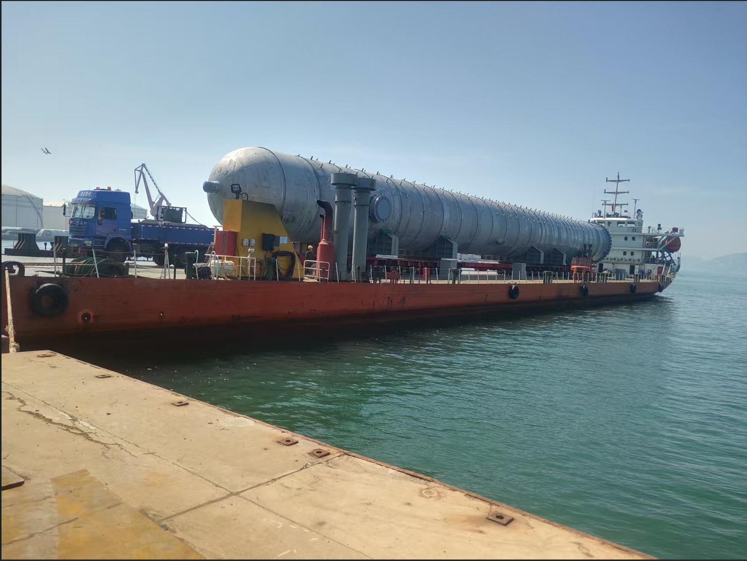 由我公司制造的浙石化硝酸吸收塔:直径5800mm,高度65000mm,重量610t,于2025年5月19日顺利装船,2025年5月21日于浙石化码头按期交货,于2025年6月安装就位。